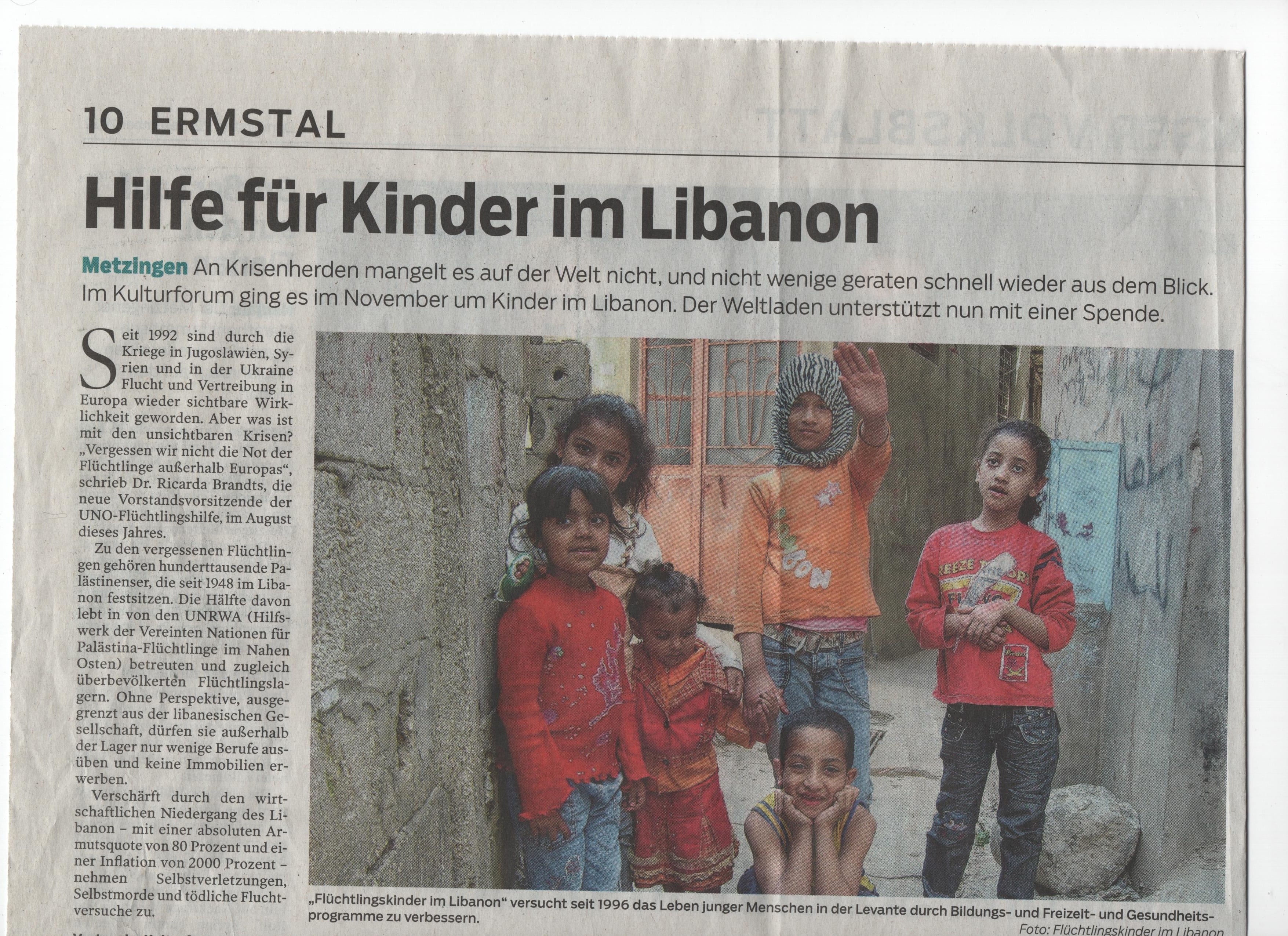 Über die aktuelle Lage im Libanon berichtete am 23. November Ingrid Rumpf auf einer Veranstaltung des Weltladens im Kulturforum Metzingen. Ingrid Rumpf ist Vorsitzende des Vereins „Flüchtlingskinder im Libanon“ (https://www.lib-hilfe.de/). Seit Anfang 1996 fördert der Verein soziale, medizinische, Bildungs-, Freizeit- und Patenschaftsprojekte, die vor allem Kindern, Jugendlichen und deren Müttern zugutekommen. Die Arbeit findet in enger Zusammenarbeit mit dem NISCVT Hilfswerk zusammen, um die Lage der Flüchtlinge an Ort und Stelle zu verbessern.